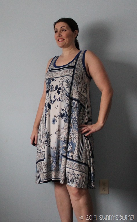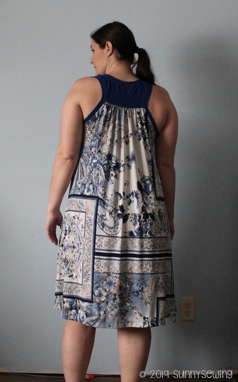 Fabric: 2 yards of a paisley blue/white floral ITY knit. I got it in a scrap box in June 2017 but I don’t know from where. I get scrap boxes from FabricMart and Knit pop so one of those. I used Royal blue cotton lycra scraps for the bands and back racer spot.