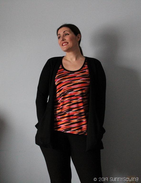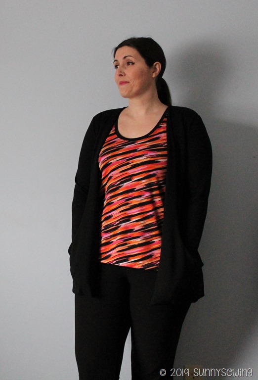 Those tiny changes made a big difference and I loved the top! The color is way wild for me; not something I would normally wear, not my colors, but with a black cardigan I like the look. It is something different and I need more variety in my closet. (Cardigan is a Jalie Drop pocket cardi 3248 I made in Mar 2017; pants are Jalie Yoga pants 3022 I made in July 2019)