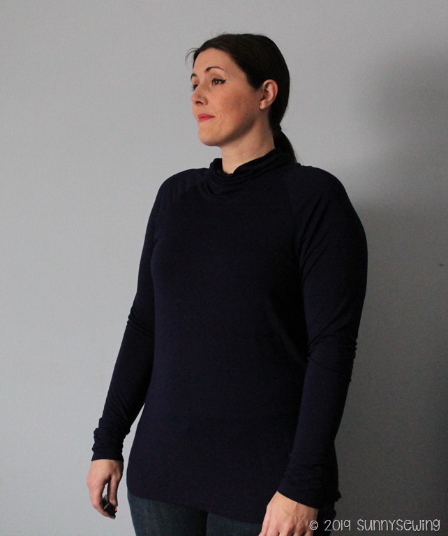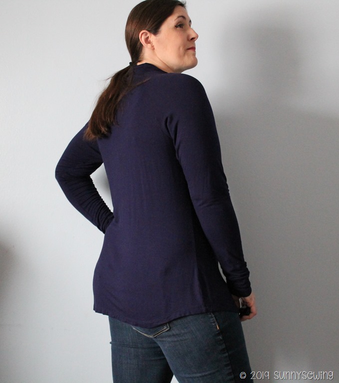 Thoughts: The neckband needs to be 1/2” longer. I don’t know, I’m just not feeling it. It is a bit baggy in the back and front below the chest. The bust is tight; the neckline feels lower than what I’m used to. It’s not that I dislike it; I just that I don’t like/like it. I will hold on to it for a while because maybe it will grow on me. I’m at this point in my life that I just want things to feel good, look good, and wear well. I don’t have time to clutter my closet with things I don’t “love”. (I’ve read too many minimalist books lately!).