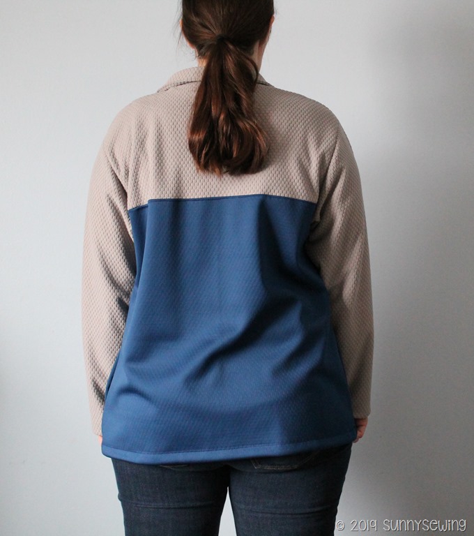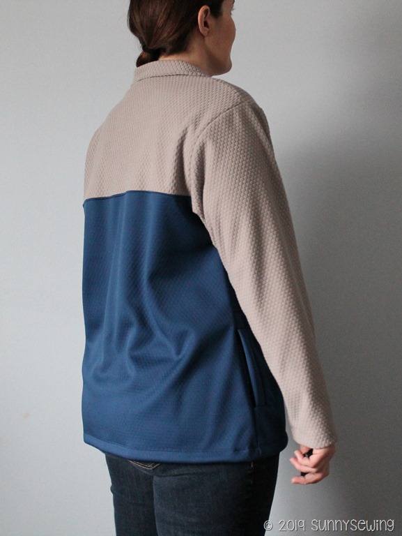 Fabric: Navy/Gray Soft Shell Grid Fleece, purchased from fashionfabricsclub Feb 2018 for $6.48/yard, I used 2.5 yards so $16.20. “This durable double layered performance soft shell fabric is created by combining a mechanical stretch micro knit fabric with a grid brick patterned fleece back. The knit face has a water resistant coating which allows water to bead off the fabric surface” I really had high hopes for this fabric. I want to like it, but I’m just not sure that I do.