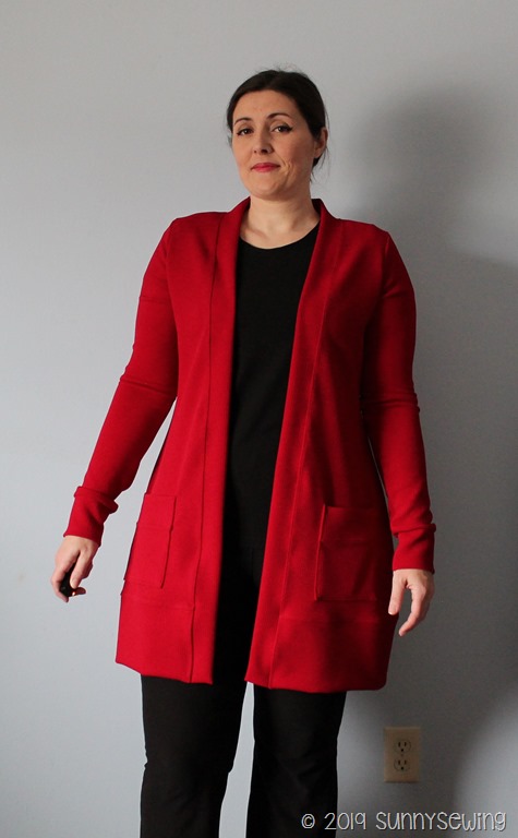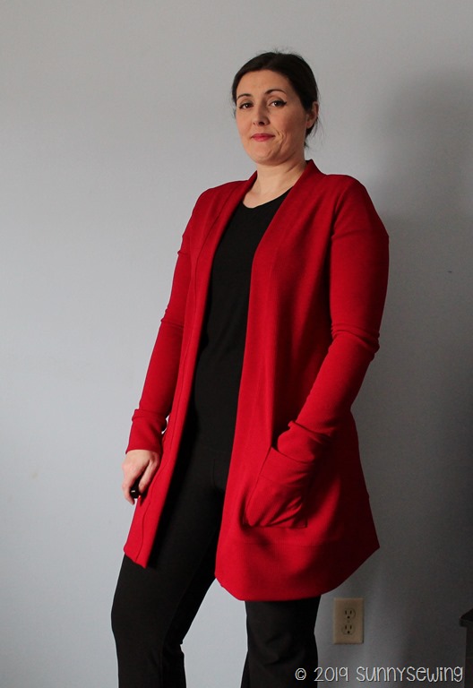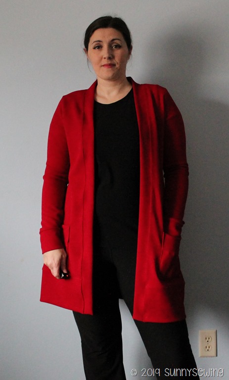 Fabric: Utterly fantastic textured knit. It is soft and smooth on the inside and textured on the outside. It was amazing to sew too. Telio Paola Pique Liverpool Knit Hermes Red Fabric; purchased from fabric.com/amazon Aug 2019 for $6.58/yard. It is listed as 96% poly, 4% spandex and medium weight. I used 2 yards. This cardigan cost $13.16.