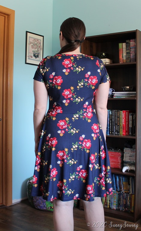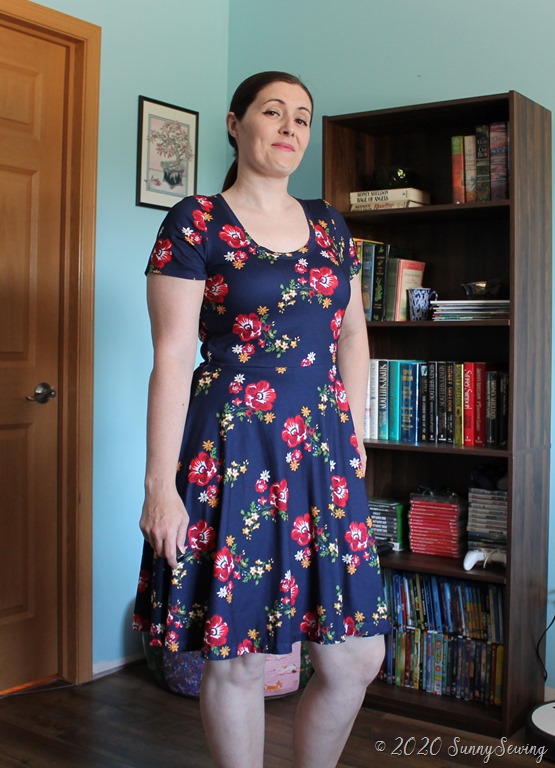 Fabric: Amazing fabric. It was love at first sight. It is a Double Brushed Poly Jersey Knit Floral Navy/Red Fabric; fiber content is 96% Polyester/4% Lycra Spandex. I purchased it August 2019 from Amazon/fabric.com for $6.38/yard. I used 2 yards for this dress for a total of $12.76