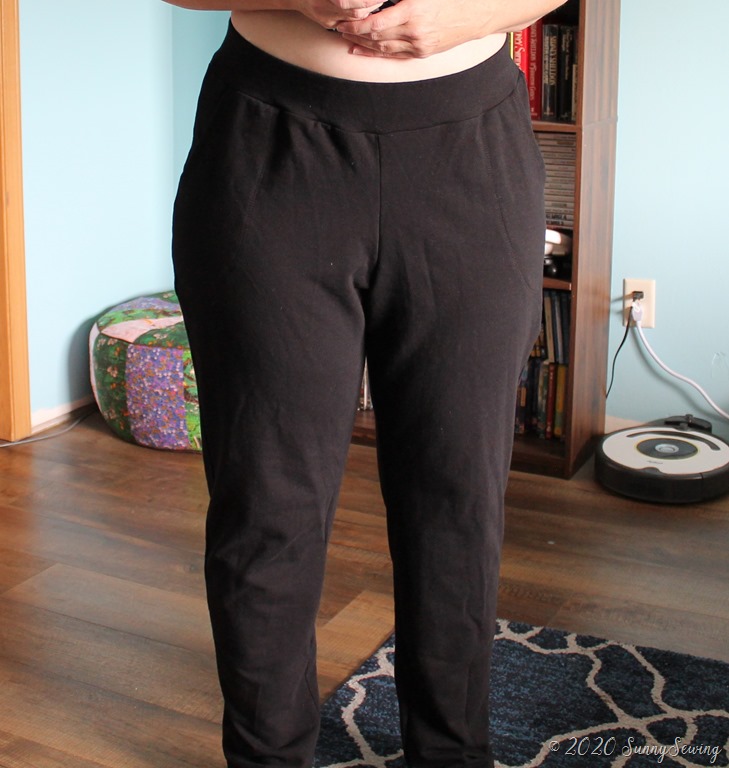 Alterations: I scooped the butt curve about 1/2 inch. I changed this pair to an enclosed elastic waist instead of a fold over yoga waist. I feel like it was too hard to keep the French terry from sliding down on this fabric with the yoga band. I used 1.5” elastic and it works great.