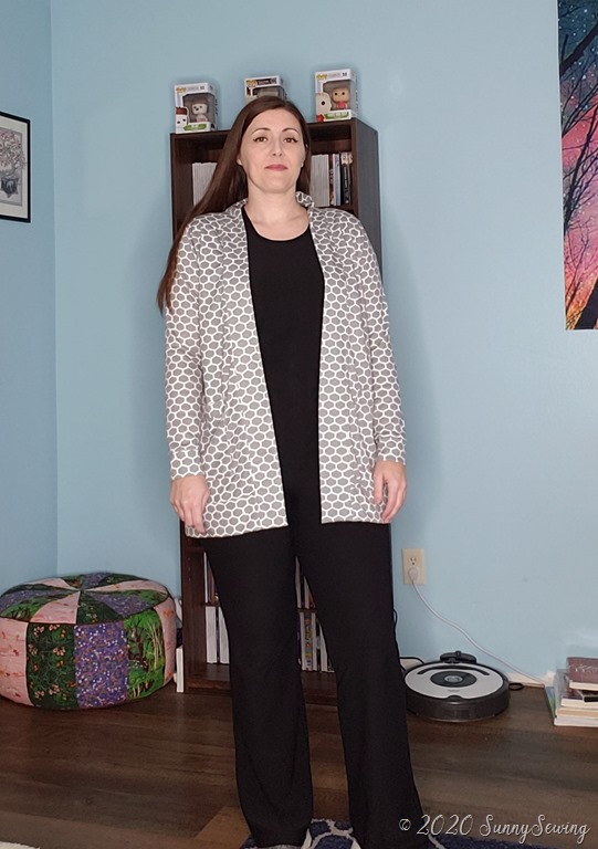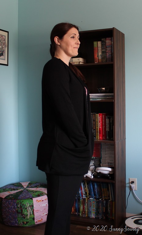 Thoughts: I like it. It feels slightly tight in the arms. I would like a little more room in the arms because I can’t wear any long sleeve shirts under this. I feel the pockets are in an odd spot, not very functional because of where they sit height-wise. It doesn’t close shut over my bust or hips, but I’m not sure it is meant to come that far in anyway. It is a nice cardigan. I like the fabric. I like the length. It was a fast, easy sew. It is just ok. I’m not sure if I would make another.