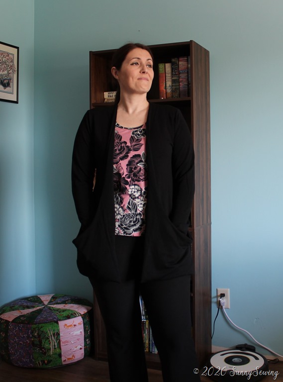 Thoughts: I love this drop pocket design, plus there are double front pieces so they act as a full facing. There aren’t many seams visible on this cardigan – just the sides and sleeves. I wear my other two a ton and have gained some weight so they are a bit small on me. I miss wearing them because I seriously reached for them and wore them almost every time I left the house. This one turned out a little big on me but I don’t care. It is soft and wonderful and I will wear it a ton too! I need to remake a gray one now. The gray one I made previously was a thin sweater knit and absolutely perfect in every way. I always want one of these drop pocket cardigans in my wardrobe. I love them!