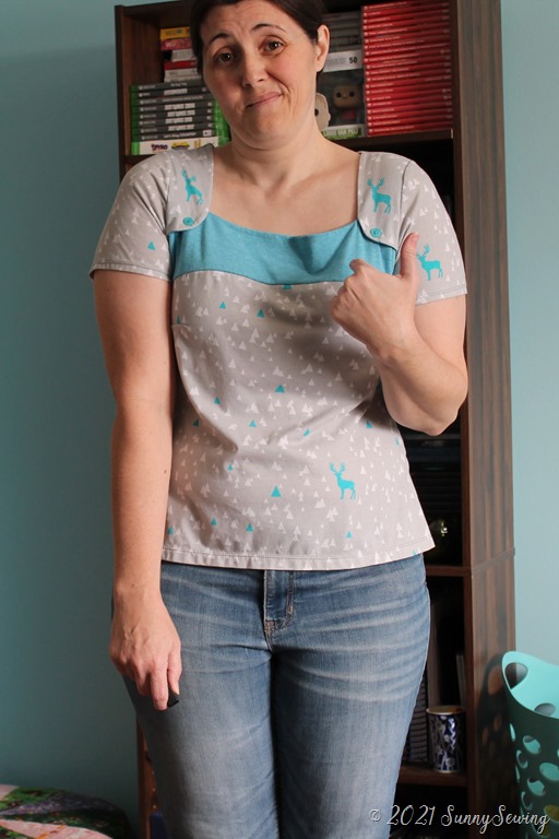 Fabric: Gray Scuba Blue Triangle Stag on White Cotton Jersey Blend Knit Fabric. 50% Cotton/50% Poly. I used 1 yard. I purchased it 07/08/15 for $6.60/yard. I got it from Girl Charlee before I realized how terrible of a company they are and how shoddy their fabrics are. I like this fabric, but I would never buy from them again. The accent is Aqua cotton lycra from purpleseamstress. A really awesome place to buy fabric and an awesome seller; seriously Mel is amazing. she ships faster than lightning. I used 1/4 yard for the accent and it is $6.50 a yard. So total for the top is $8.23