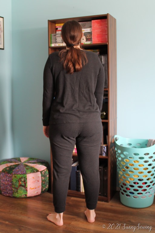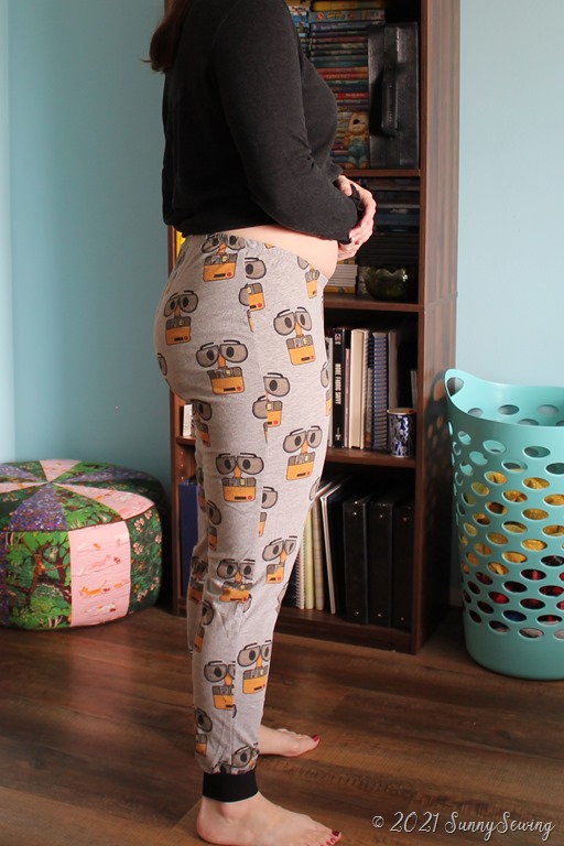I added the 1” to the leg length and used the same pattern and alterations as above. This fabric is a less stretchy cotton jersey and the pants are a tiny bit too tight – but now I’ve lost a lot of weight and they fit just right. this fabric doesn’t have the right stretch for the pattern, oops. But I love them anyway.