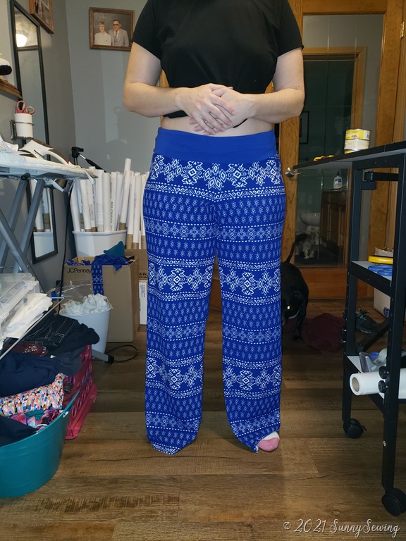Thoughts: LOVE these pants! Love this pattern. It sews fast. It feels great to wear them. They are all about comfort and that is me for sure. If I had to change one thing its that the yoga waistband gets looser as the day goes on so I am constantly pulling up my pants. I usually add elastic in my bands to hold them up.