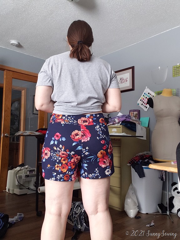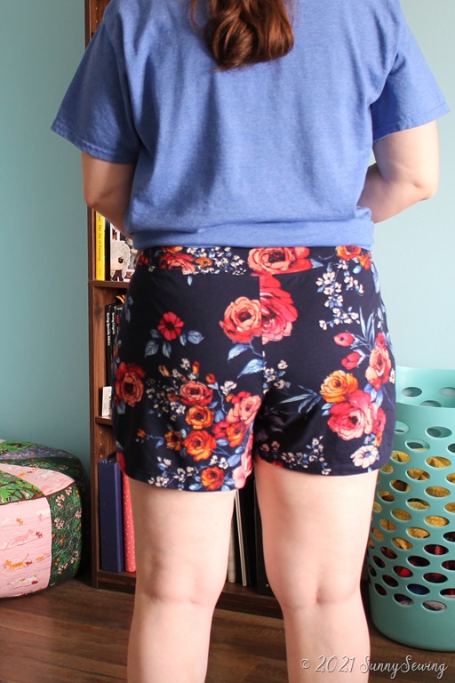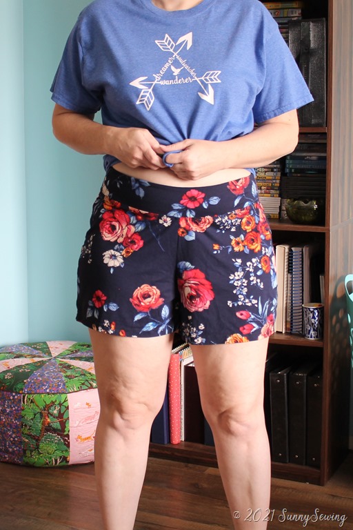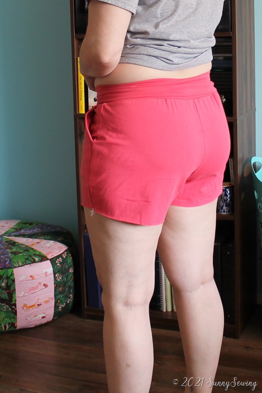 Alterations: 1/2” butt curve scooped out (common for me). I sewed the faced waist option and added 33” of 1/4” elastic to the top of the faced waist; I really love this option. Having the 1/4” elastic in the waist keeps these shorts up all day long but is soft enough that it doesn’t aggravate my stomach.