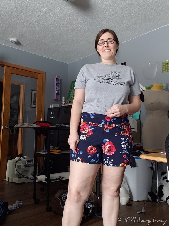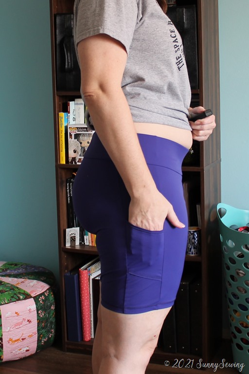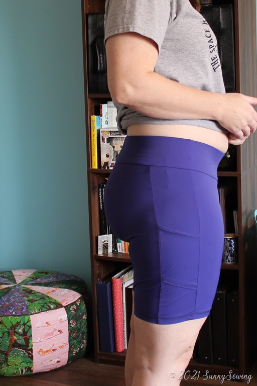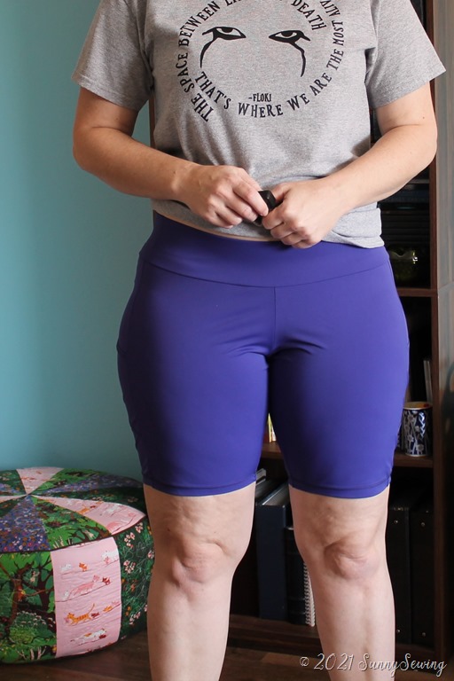 Thoughts: I love these shorts!!! They fit amazing. They feel amazing. They are super comfortable. I lived in these after my surgery and wish I had made 6 more pairs to get me through a week of them. I love them and will definitely make more. I can’t wait to try the pants option too! (since I lost 35lbs since I made these, they are loose on me now. I will have to size down and make more! Blue shirt is now, Gray shirt is before). These are very, very similar to the new Jalie Sylvie pants pattern. (spoiler: I absolutely LOVE that pattern).