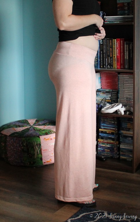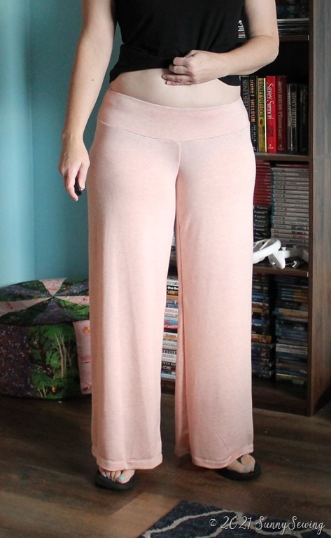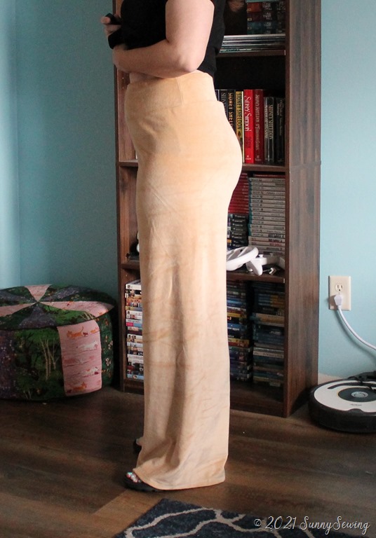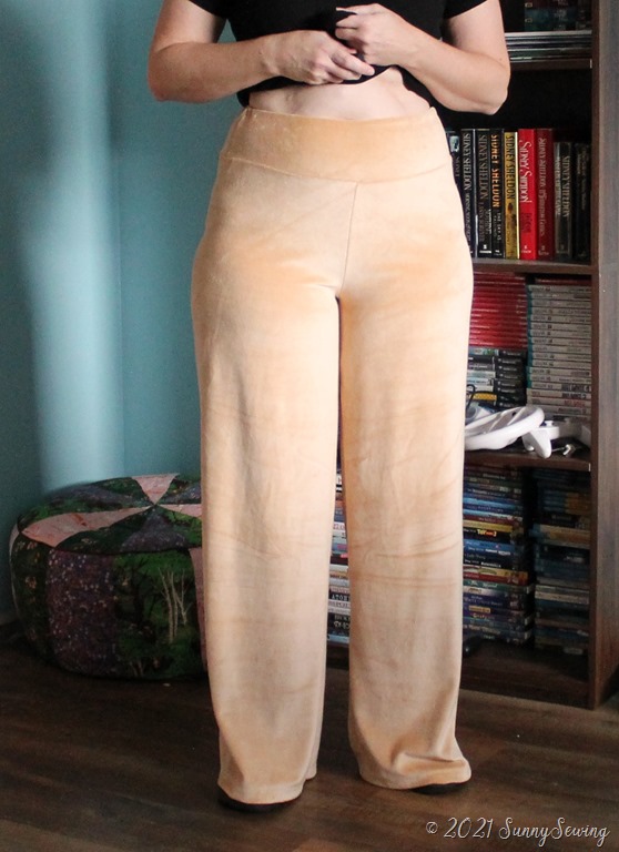 Thoughts: I love these pants! They are such a fast sew and so comfortable to wear. Each fabric has their own strengths. The ITY is flowing and cooling. They can look dressy but are still secret pajamas. The french terry are so comfortable and the velour… oh my gosh the velour might be my favorite. They are thick and luscious and soft and comfortable. I know they did not have the correct stretch requirement and they are a tiny bit snug, but they fell so dang amazing.