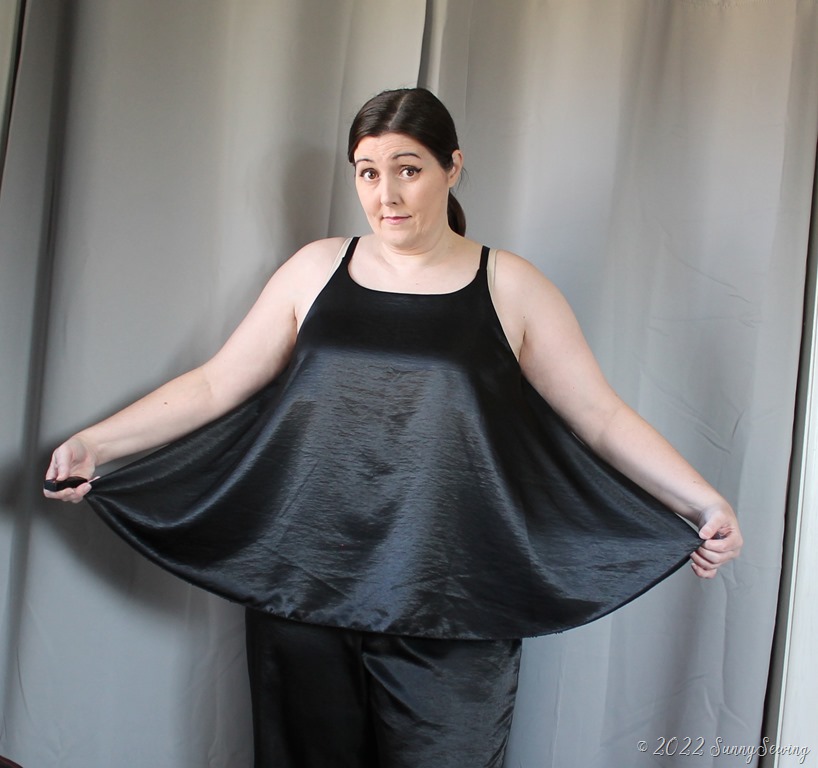 Sewing: sewing the straps were a major pain in the ass with this silky, slippery fabric. Stuffing them into the back “holes” between the fabric and facing were a total challenge. Many swear words ensued.