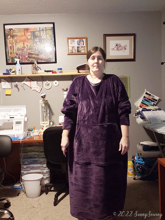 She loves this thing. It is enormous even for me! I find it kind of hilarious. But she wears it all the time and her cat sleeps in the pouch in front. It was disgusting to sew because ….. minky type fabric is a beast. There was purple fuzz everywhere and my poor machines. They got a good cleaning afterwards. I have a decent amount of the purple “fabric” left because I used a queen sized blanket. It is a cheap way to get some good, thick, fuzzy material when you want a robe or a snuggie or a wearable blanket.