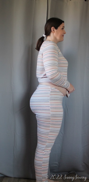 Fabric: leftover yard from pjs above: Muted Tan/Eggshell/Heathered Gray/Cadet Blue Polyester/Lycra Horizontal Stripe Brushed Sweater Knit – NY Designer – 62W. I ordered 3 yards on Mar 1, 2022 from FabricMart for $4.99 per yard and used 1 yard.
