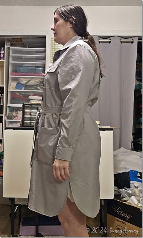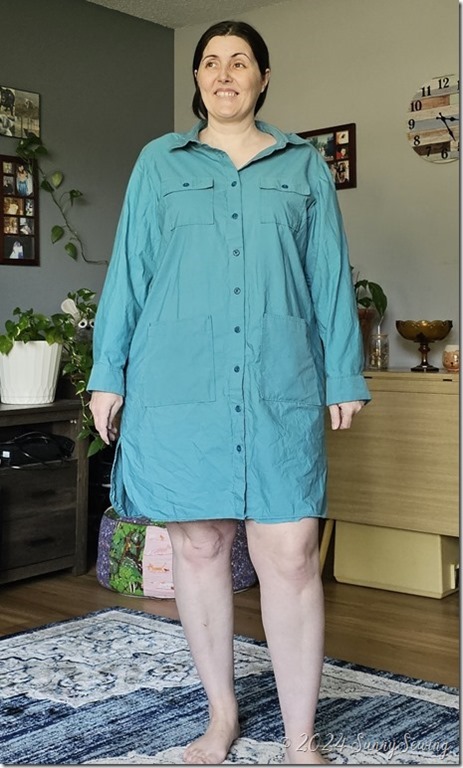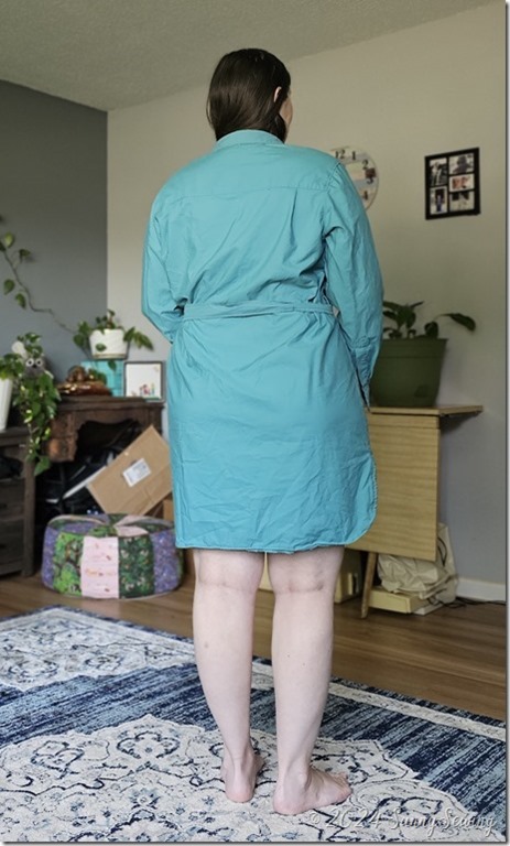 This one really challenged me for 2 reasons. #1 it is a looooong sew. I had to break it up into many days. #2 I have never sewn a shirt sleeve placket before. I have sewn just a handful of other woven “proper” collars, one on my Jalie Rose 3881 (love that top) another on a McCalls 4769 Shirtdress back in 2013, and a few others. So this sew pushed me out of my comfort zone a bit. You all know I like the fast sew, instant gratification knits. I need to branch out and sew more woven fabric in the future here. If I were to change anything it would be to add a little more room for my hips and rear. I feel it is a tad snug there. I like it more without the belt. It is loose and comfortable. I disliked things on my stomach before this surgery (having 2 other stomach surgeries in my past) but after this surgery, I really do not like things touching my stomach.