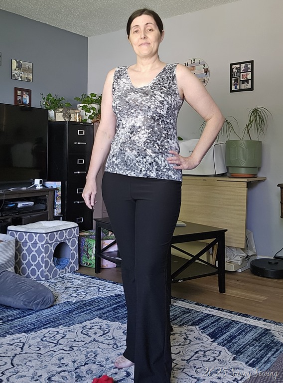 This outfit makes me feel good. I love how it looks on my body shape and I should make more, LOL. This is why I love Me Made May. Taking the photos and doing all the write ups is time consuming but so helpful. I see what looks good on my body and what doesn’t with sewing patterns, fabrics, colors, etc. It helps me feel good when I find an outfit that I’m like Woah, this one feels great to wear and gives me some confidence. This is one of those outfits. I love black and gray on me. These both are super comfortable fabrics and patterns to wear, yet I look put together. Both are for sure added to my “to sew” list for the future.