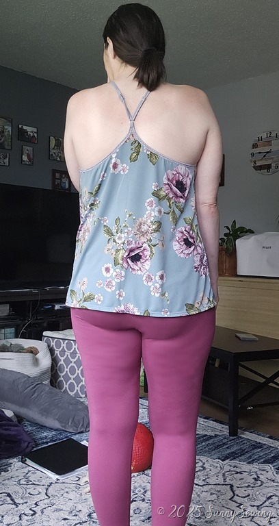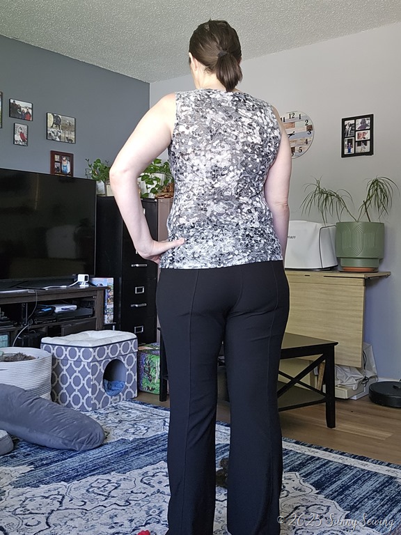 The top, I cannot say enough good things about it. It is flowy, so cute in the back, easy to sew, and I love both the pattern and fabric. It is a top I wear a lot. I made it in a soft ITY (one of my favorite fabrics to use because of the excellent drape and cooling feeling). I need to remember to make more.