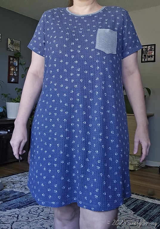 Dress Fabric: Colonial Blue/White 100% Polyester Floral Print Waffle Sweater Knit 58W, purchased from FabricMart, June 2024 for $3.99/yard. I used the full 2 yards so this nightgown total is $7.98.